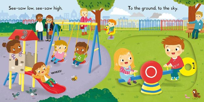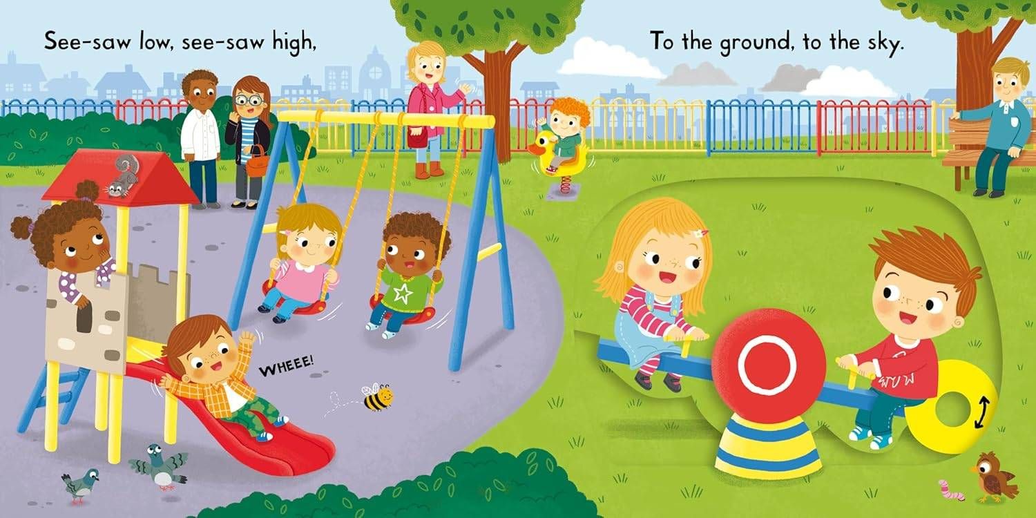 Push, pull and slide the tabs to enjoy a day out at the Busy Park! Visit the playground, spots lots of different animals and have a picnic.