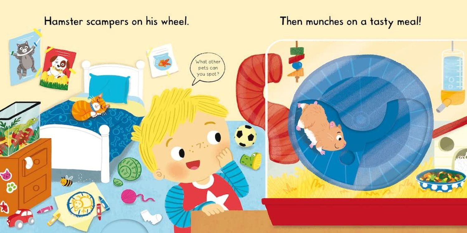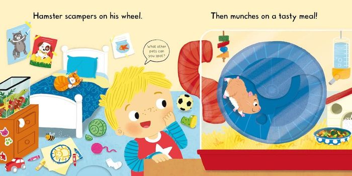 Push, pull and slide the tabs to learn about looking after Busy Pets! Feed the dog some treats, watch the hamster turn in its wheel and visit the bunny in the garden.