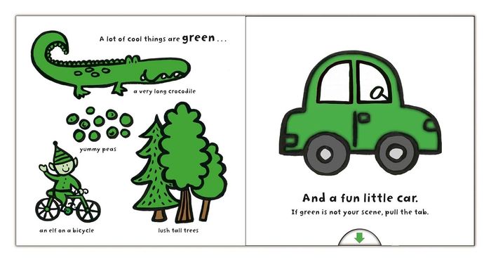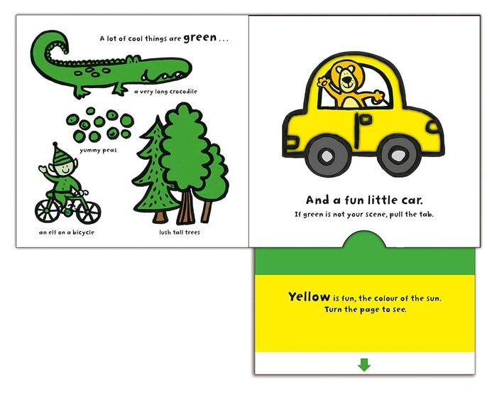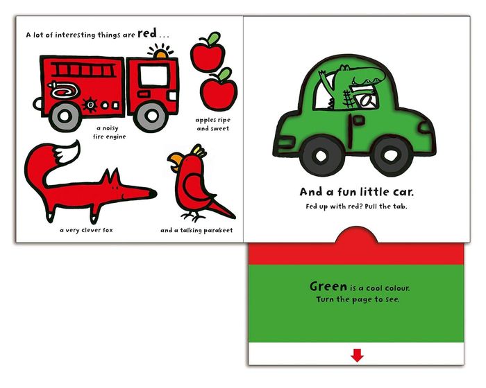 With clever acetate pictures that change at the pull of a tab, this imaginative book is a fun way to learn about color. Each spread focuses on a single color, with lively text and fun illustrations of familiar things on the left-hand page, and a little car on the right. Children can then pull the tab and watch the car magically change color and reveal something a little unexpected! Little ones will love deciding which color is their favorite, while learning key first words and color recognition.