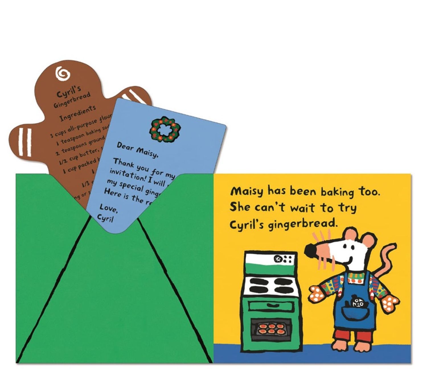 The holidays are coming, and Maisy’s friends are thrilled to receive invitations to her party. It will be fun to play games, tell stories, sing carols, and eat treats! Dotty, Eddie, Cyril, Tallulah, and Charley all send thank-you notes to Maisy, each with a little something she might enjoy. And Maisy has something to give to her readers as well! Kids will be excited to reach into the envelope pockets to find: