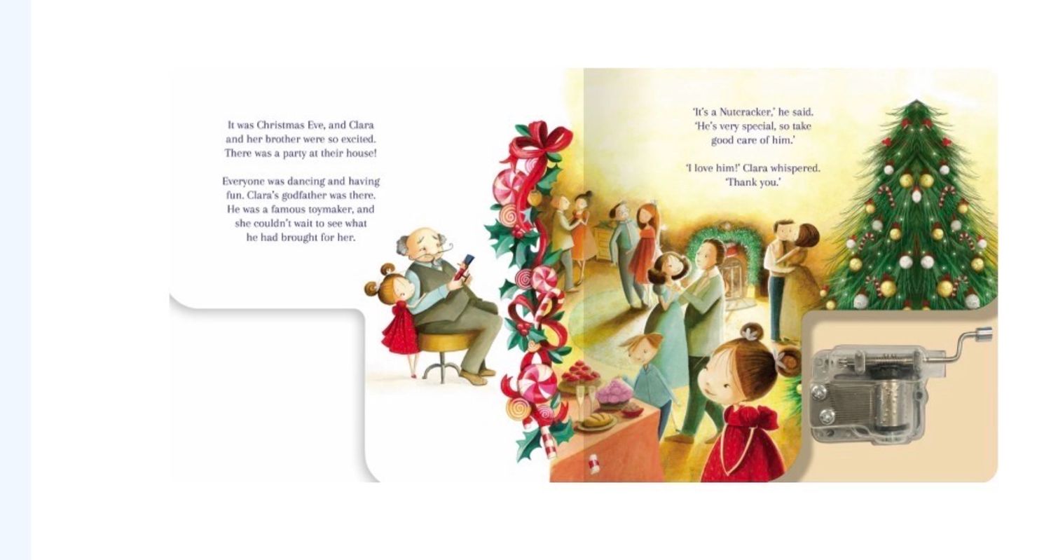 Clara's father gives her a wooden nutcracker on Christmas Eve. The realm of toy soldiers and gorgeous fairies awaits Clara in this beautifully illustrated Christmas tale. A wind-up music box allows children to enjoy the story's accompanying music while they read along.