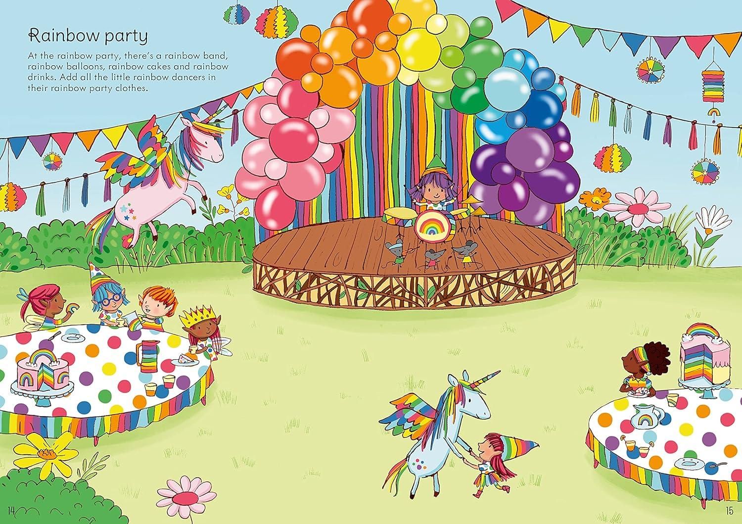 An enchanting book with hundreds of stickers to add to magical scenes full of rainbows, fairies. pixies and unicorns. Join the the fairies and pixies as they splash in rainbow puddles, paint rainbows in the sky, play with unicorns, prepare for a rainbow party and snuggle up in rainbow beds at the end of the day. There are over 200 stickers to add to the delightful scenes including rainbow accessories, clothes, butterflies and flowers, fairy houses, fairy cakes, a fairytale castle and an enchanted wood.