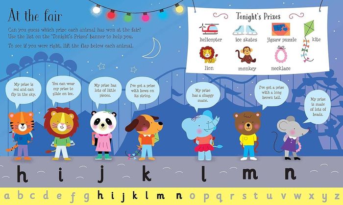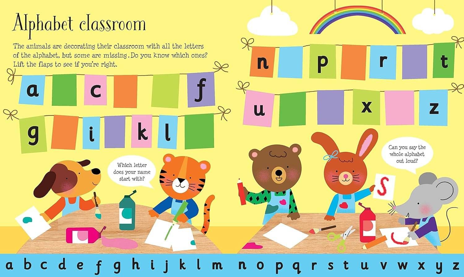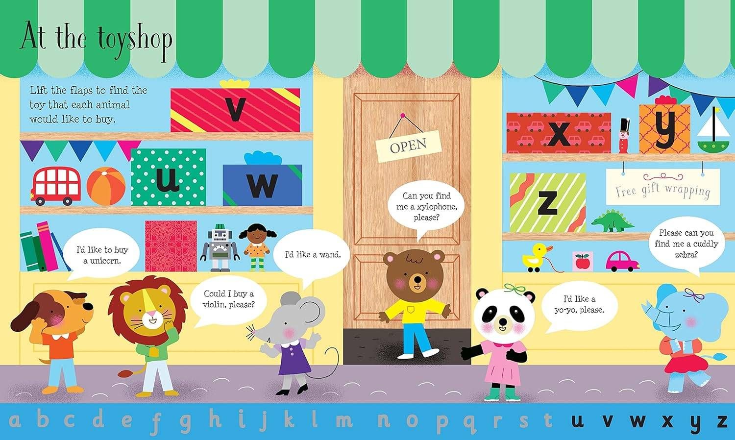 A fun, interactive way to learn the alphabet, with letter, sound and formation activities and over 100 flaps to lift. Children can match sounds and letters on the farm, guess letter sounds for animals at the zoo, find toys in the toyshop, and much more. There's also a page of little and big letters, and alphabet letters to trace with their finger.