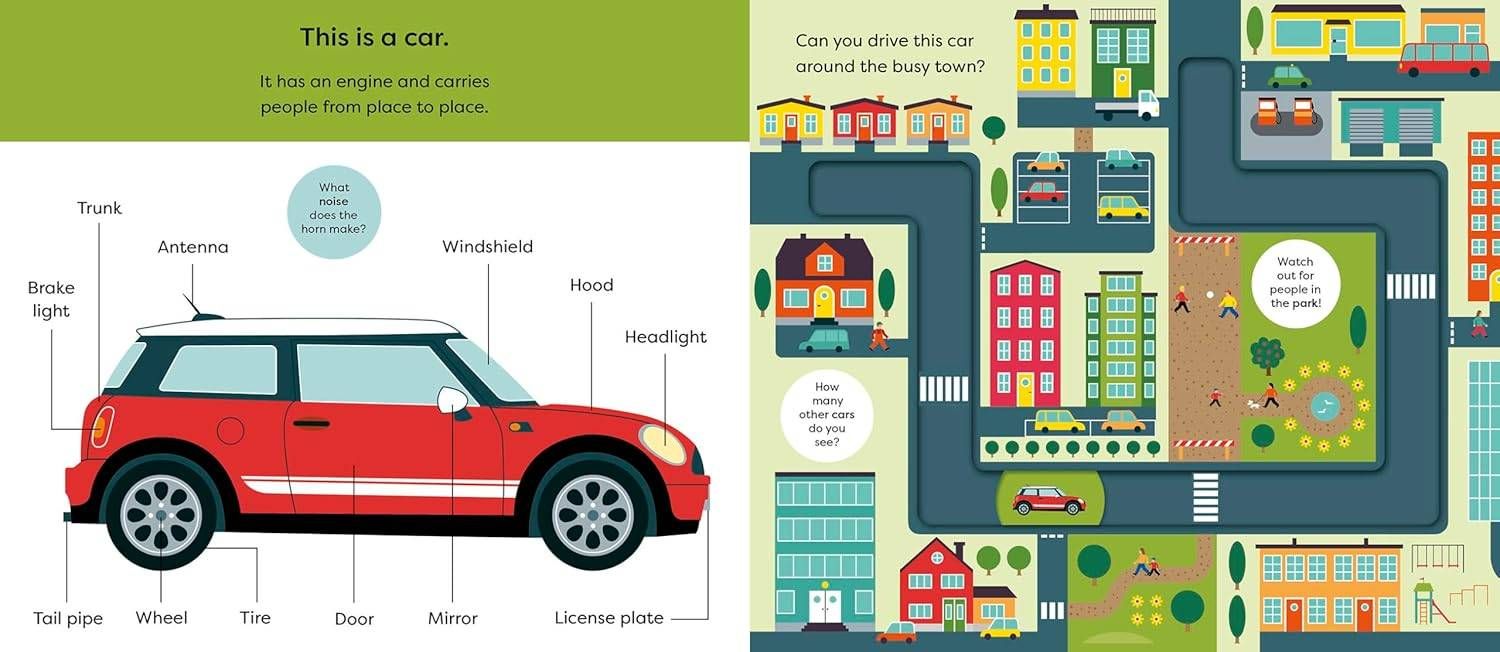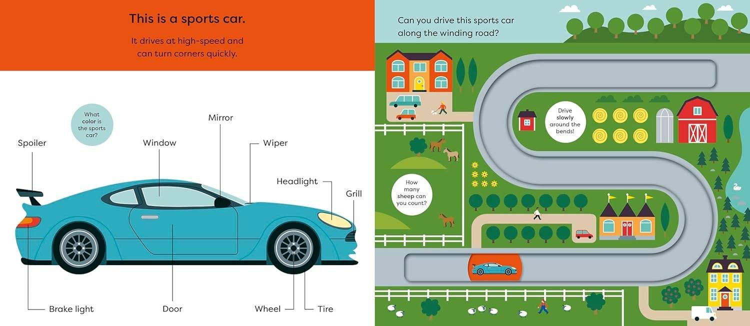 Learn vehicle vocabulary with simple first words, clear diagrams, and helpful text prompts to encourage discussion. Then, drive 5 types of transportation around 5 tracks with a moving slider. The perfect book for children who love racecars-and being in the drivers seat!